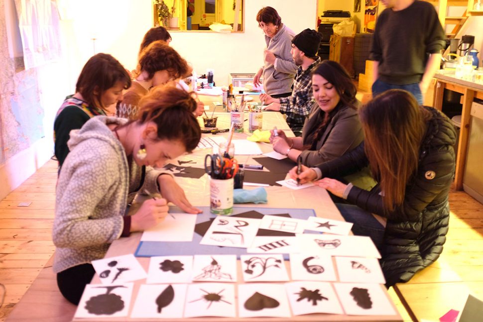 Dans un principe d’horizontalité, les ateliers favorisent un principe de partage d’idées, de connaissances, d’outils, de matières et d’expériences. Nous proposons simplement un processus de création par étapes successives pour faciliter l’expression de chacun, tout en laissant la part belle au tâtonnement, à l’entraide et au hasard.