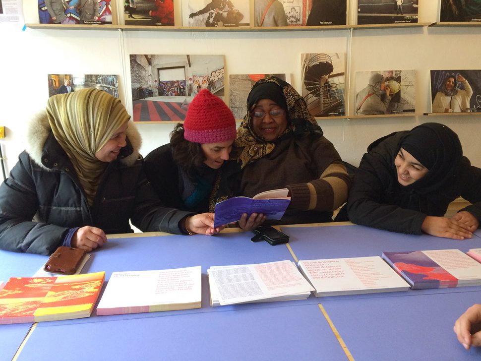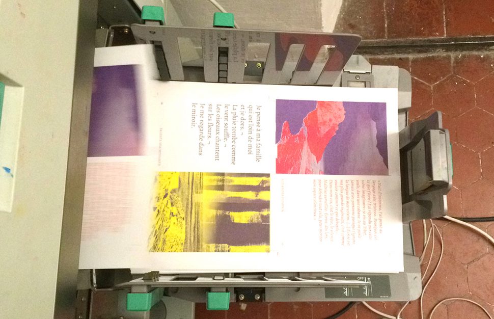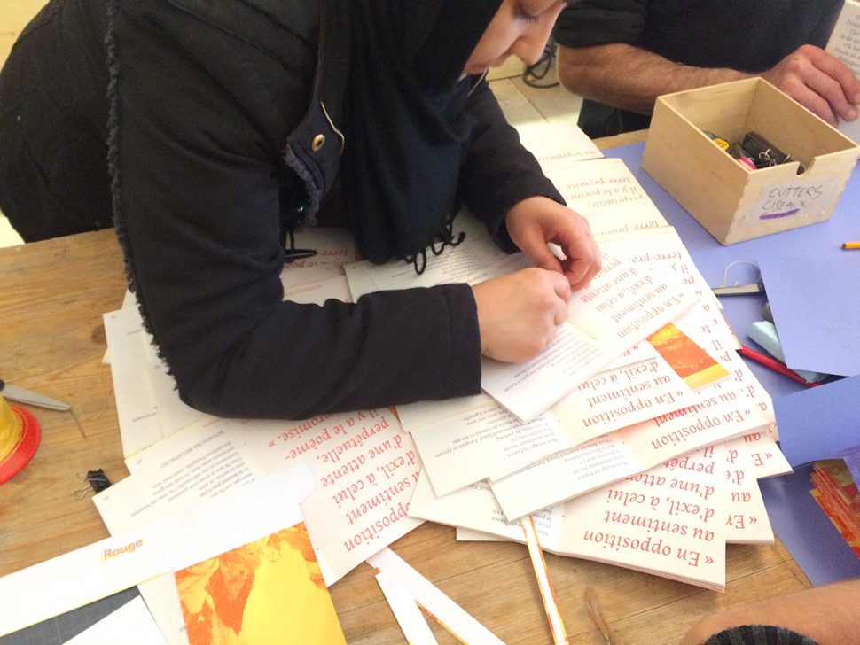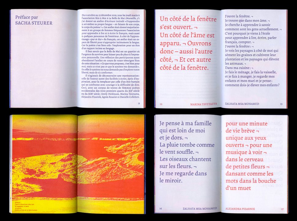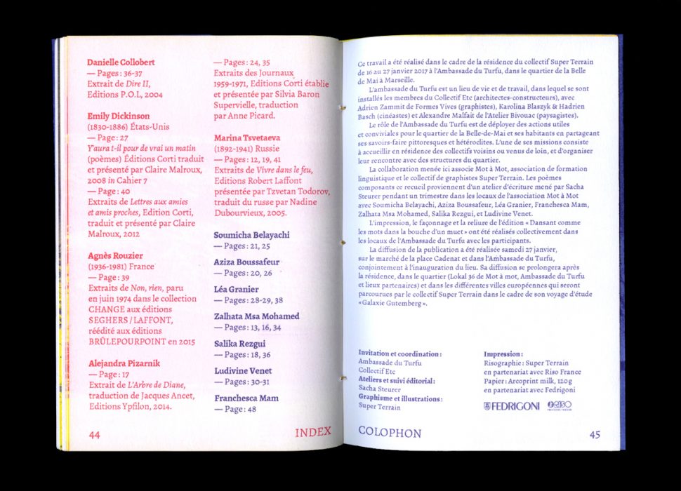 Le collectif Super Terrain est un trio de graphistes basé à Nantes. À ce moment là, ils s’apprêtent à entamer un voyage d’étude en Europe, autour de l’objet imprimé, avec un camion transformé en imprimerie mobile. Marseille était la première étape. Nous avons alors pensé à l’association Mot à Mot, qui agit dans “le champ de la formation linguistique pour les migrants, les allophones, ou simplement pour « celles et ceux qui ont fait l’aventure »”, qui disposait justement un ensemble de poèmes – écrit par un groupe de femmes encadré par Sacha Steurer pendant un trimestre – qu’elle souhaitait publier et diffuser.