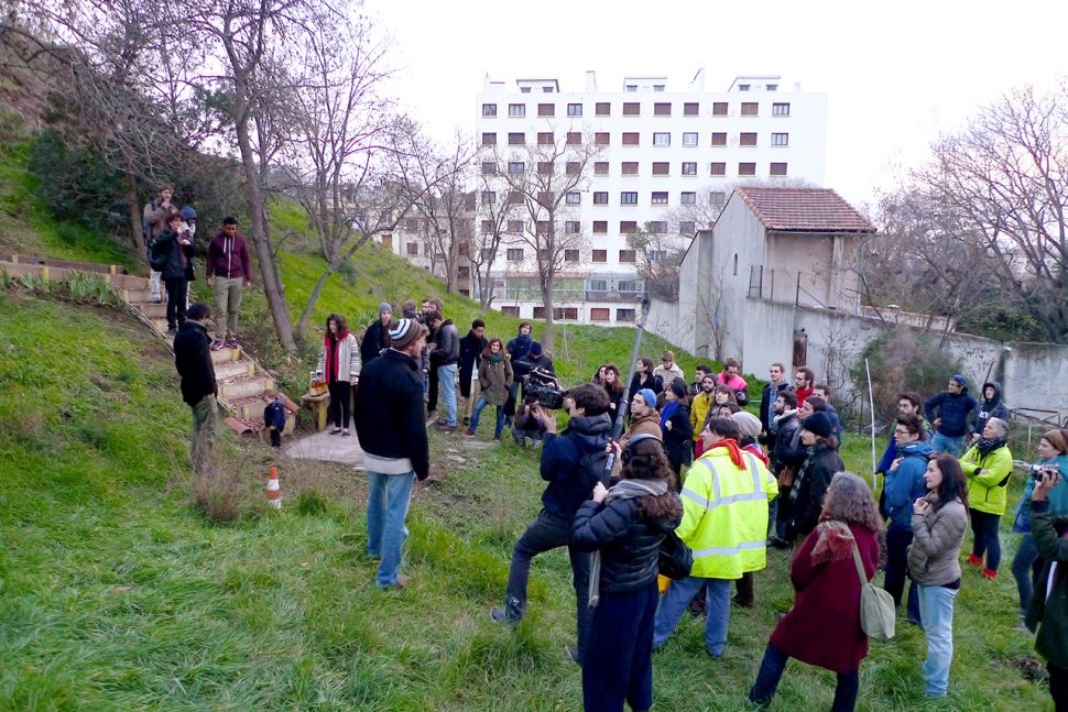 À la fin de la résidence de l’Atelier Bivouac, les résidents ont lancé une invitation publique pour une déambulation dans le quartier, guidés par l’intrépide Nicolas Mémain, avec comme point de chute la descente des marches de l’escalier et la lecture de l’abécédaire au coucher du soleil.
