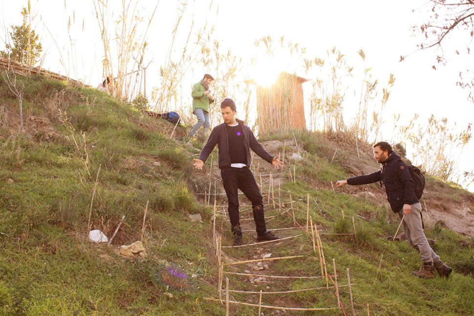 Atelier Bivouac est un collectif de paysagistes basé entre Brest et Marseille. Il “explore et expérimente autour du projet de paysage, en habitant le lieu de la commande et en réemployant les ressources trouvées sur place“. Une rencontre a alors été organisée avec l’association Le Jardin de gibraltar, pour proposer une collaboration. Le sujet était tout trouvé : les jardiniers avaient besoin de créer de nouvelles parcelles dans une prairie en contrebas du jardin, mais le talus friable en rendait l’accès difficile. Les paysagistes se sont donc attelé à réfléchir à un cheminement pour rendre la pente praticable.