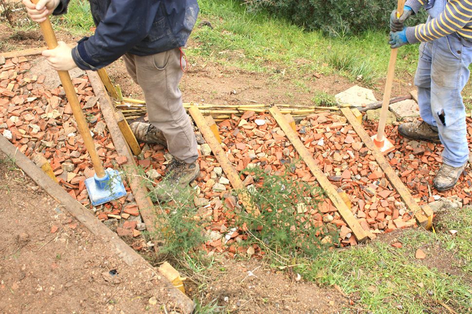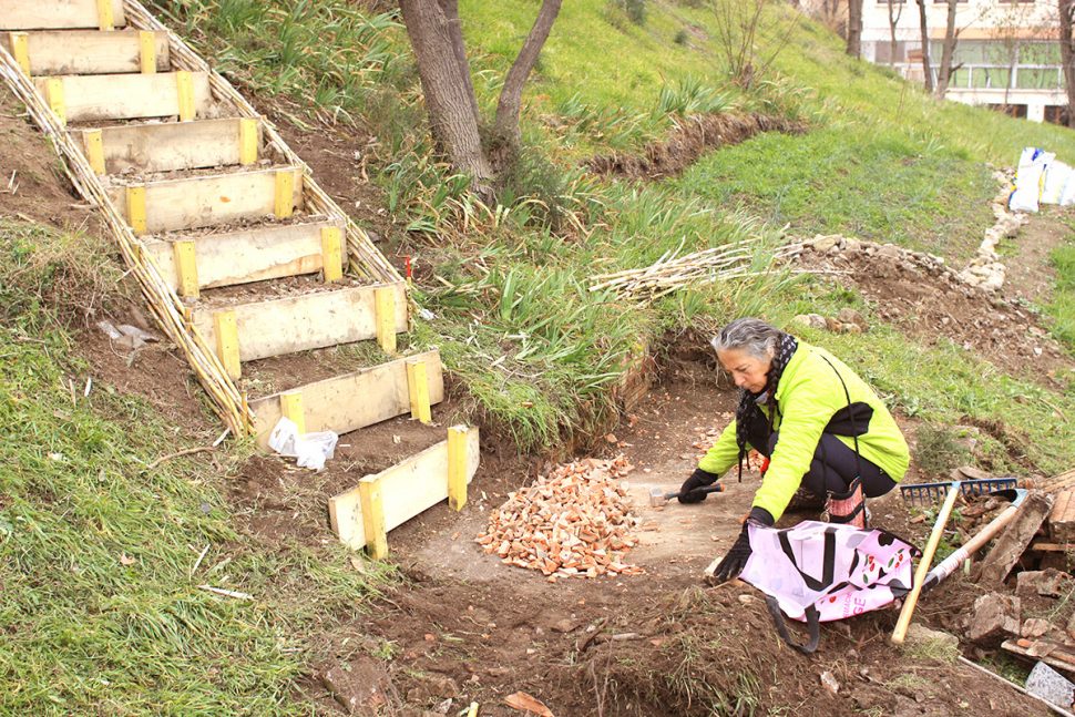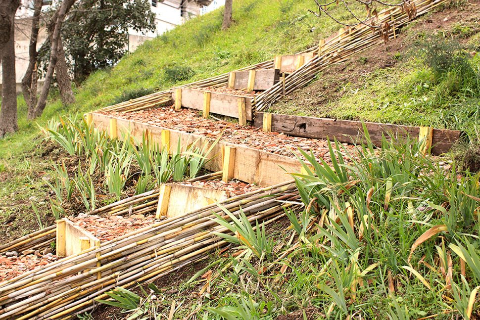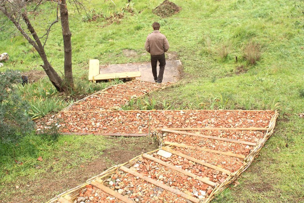 La deuxième semaine, ils ont commencé la construction d’un escalier d’une trentaine de mètres, zigzagant dans les pentes. Les rebus extraits du sol par les jardiniers et la canne de Provence omniprésente au jardin sont devenus des ressources pour le projet, le bois de coffrage a été récupéré sur des chantiers de construction. L’escalier a permis la mise en culture de nouveaux espaces dans les pentes et dans la prairie en contrebas.