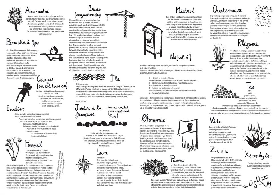 La première semaine, les paysagistes ont passé beaucoup de temps sur place pour rencontrer les jardiniers, étudier les aménagements déjà réalisés et inventorier les ressources disponibles. Ils ont ensuite compilés leurs trouvailles dans une carte-abécédaire, imprimée dans le même temps par Super Terrain.